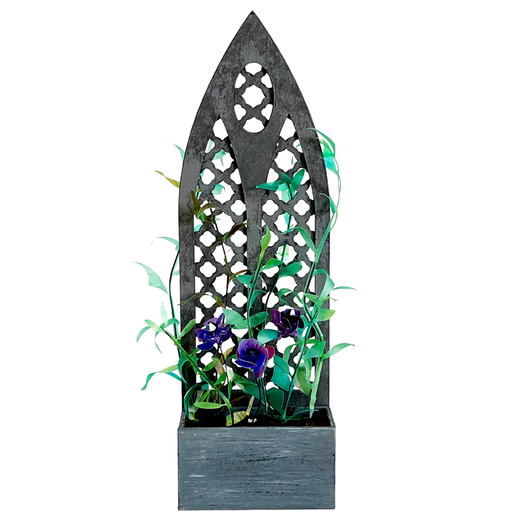 Cut out from Cricut kraftboard with the fine point blade and green mat, simply bend the top and bottom edges over to make the arched slots and turn the side tab/arms in and glue them to each other at either end.